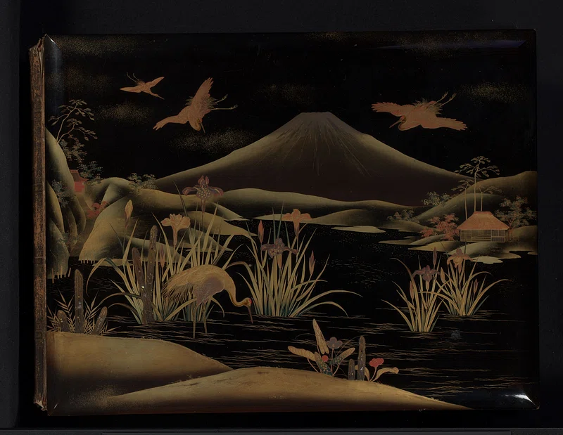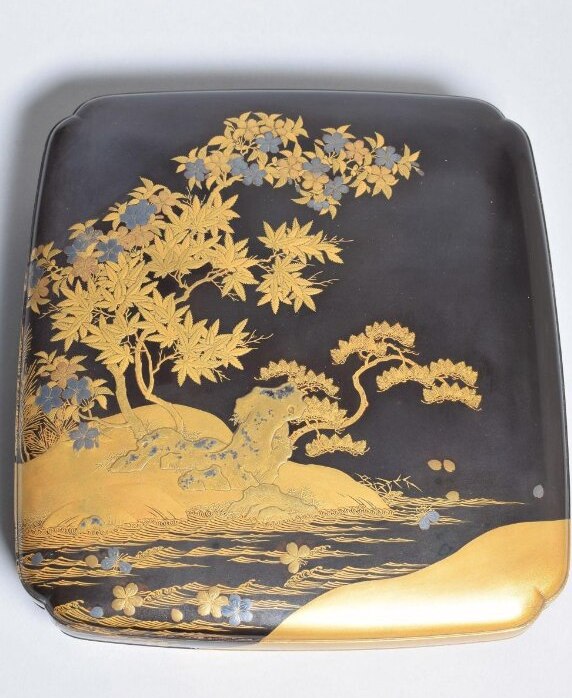 Krajobraz - W wielu dziełach lakowych wiodący temat to „widoki”. W dawniejszych obrazach są one bardziej symboliczne, w późniejszym okresie bardziej realistyczne. Mogą zawierać obiekty w postaci chat krytych strzechą albo dworów, łąk, rzadziej lasów. Na zdobieniach wpleciona jest zwykle płynąca woda. Szczególnie ulubione były przedstawienia skał z sosnami wykrzywionymi przez wiatr. Powszechnym tematem jest krajobraz górski. Obraz jest budowany w oparciu o zasadę : „góra daleka” i „góra bliska”. Pierwszy rodzaj to przedstawienie góry w oddali albo łańcucha górskiego z elementami bliższej perspektywy. Góra bliska to zwykle fragment skały z nawisami, towarzyszą mu różne rośliny a czasem wodospad. Zdarzają się także pejzaże w postaci widoków morza ze statkami i łodziami.