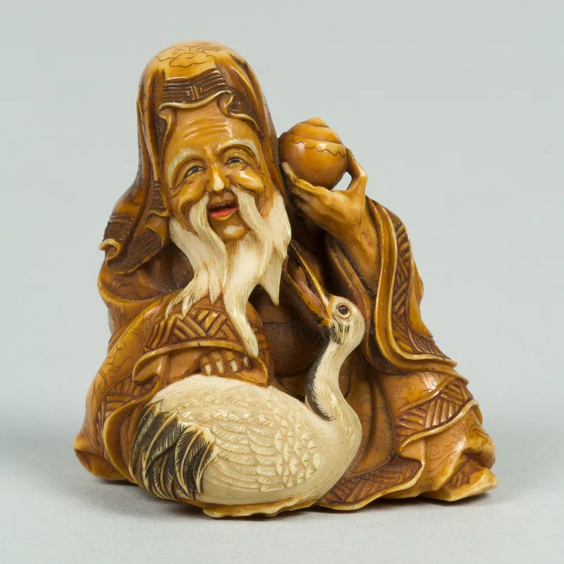 Fukurokuju - bóg mądrości, powodzenia, fortuny i długowieczności. Ma postać niskiego, starszego mężczyzny z nienaturalnie wydłużoną czaszką, co znamionuje mądrość i długą naukę. W jednej ręce trzyma berło, a w drugiej wachlarz. Posłańcami Fukurokuju są żuraw lub żółw (symbole długowieczności).